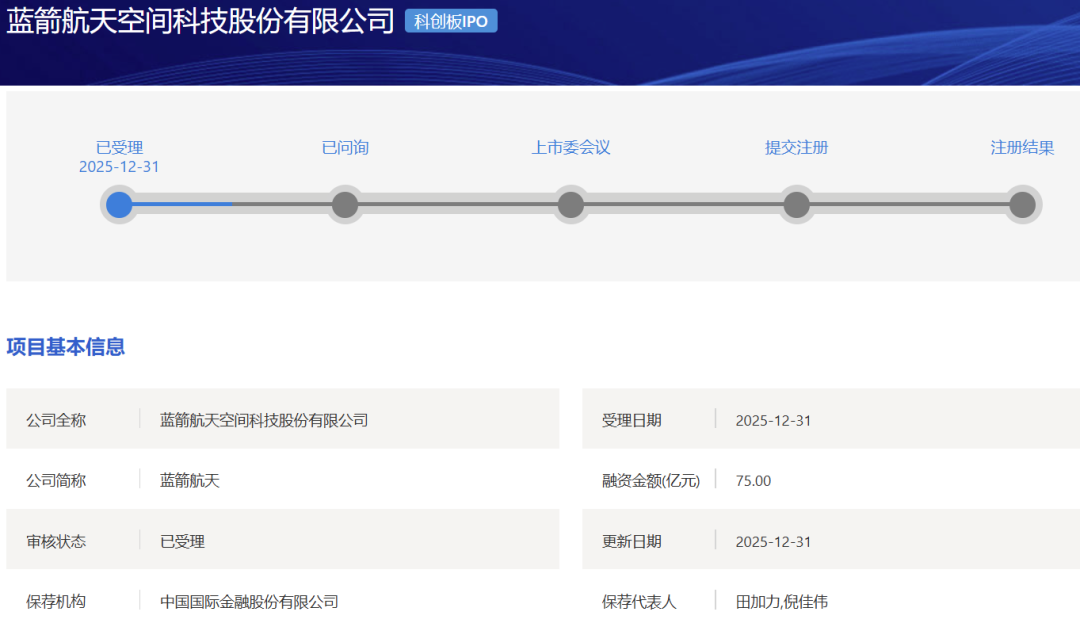 12月31日,蓝箭航天空间科技股份有限公司科创板IPO获得受理,这是上交所12月26日发布《上海证券交易所发行上市审核规则适用指引第9号——商业火箭企业适用科创板第五套上市标准》后首家商业火箭企业科创板IPO获得受理。蓝箭航天本次IPO保荐机构为中金公司,拟募资75亿元。