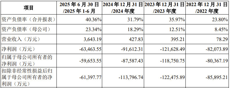 2022年、2023年、2024年及2025年上半年,公司实现营业收入分别为78万元、395万元、428万元及3643万元, 归母净利润分别为-80367万元、-118751万元、-87587万元及-59654万元,扣非归母净利润分别为-85895万元、-122476万元、-113797万元及-61398万元,尚未实现盈利。