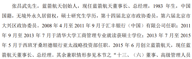 张宇蛟先生现任蓝箭航天董事会秘书,1984 年生, 2011 年 9 月至 2019 年 4 月于北京市金杜律师事务所任职;2019年 4 月至今历任蓝箭航天资本市场部总经理、法务部总经理、董事会秘书。